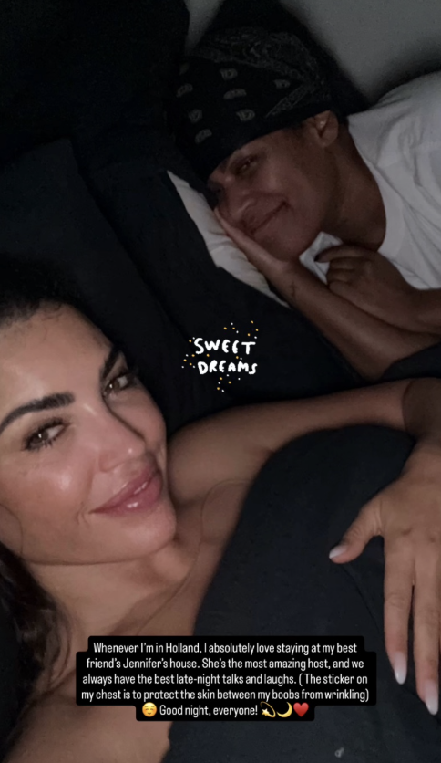 Op Instagram poseerde Yolanthe vanuit het bed van haar beste vriendin Jennifer haar vaste crashplek tijdens Nederlandse uitstapjes. “Als ik in Nederland ben, hou ik er ontzettend van om bij mijn beste vriendin Jennifer te verblijven. Ze is de meest fantastische host en we hebben altijd de beste gesprekken”, jubelt ze. Mooie woorden, maar wie keek er nog naar de vriendschapsverklaring toen er een mysterieuze sticker tussen haar borsten prijkte.